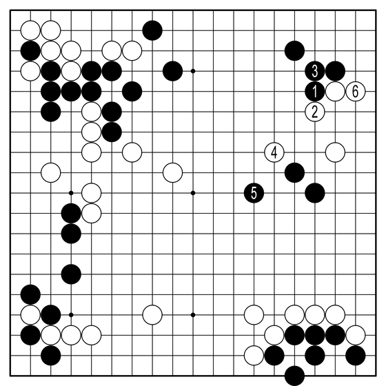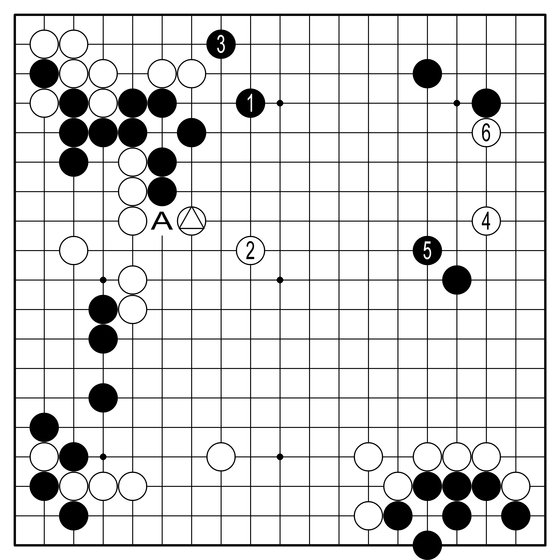 ◆실전 진행=흑1에 백2의 맞젖힘, 흑3으로 잇자 백4로 가볍게 날아간다. AI의 블루 스폿이다. 좋은 감각이다. 아마 이 백4가 놓이던 시점이 이 판에서 백의 전성시대였을 것이다. 흑5엔 6으로 뻗어 능률적으로 삶의 탄력을 만들어냈다.