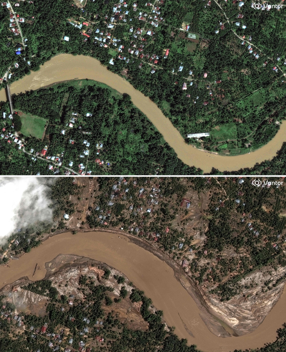 최근 동남아시아에 기록적 폭우가 내렸다. 위쪽은 홍수 피해를 입기 전인 지난해 12월 14일 인도네시아 아체주. 다리가 끊기고 도로와 건물이 침수된 현재 모습(아래쪽)과 비교된다. [AFP=연합뉴스]
