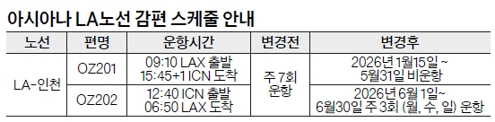 아시아나항공이 내년 상반기 로스앤젤레스 노선을 일부 감편한다. 아시아나항공은 하루 2회 운항하던 LA~인천 노선을 내년 5월까지 야간 출발편인 OZ203편만 운영한다. 표 참조