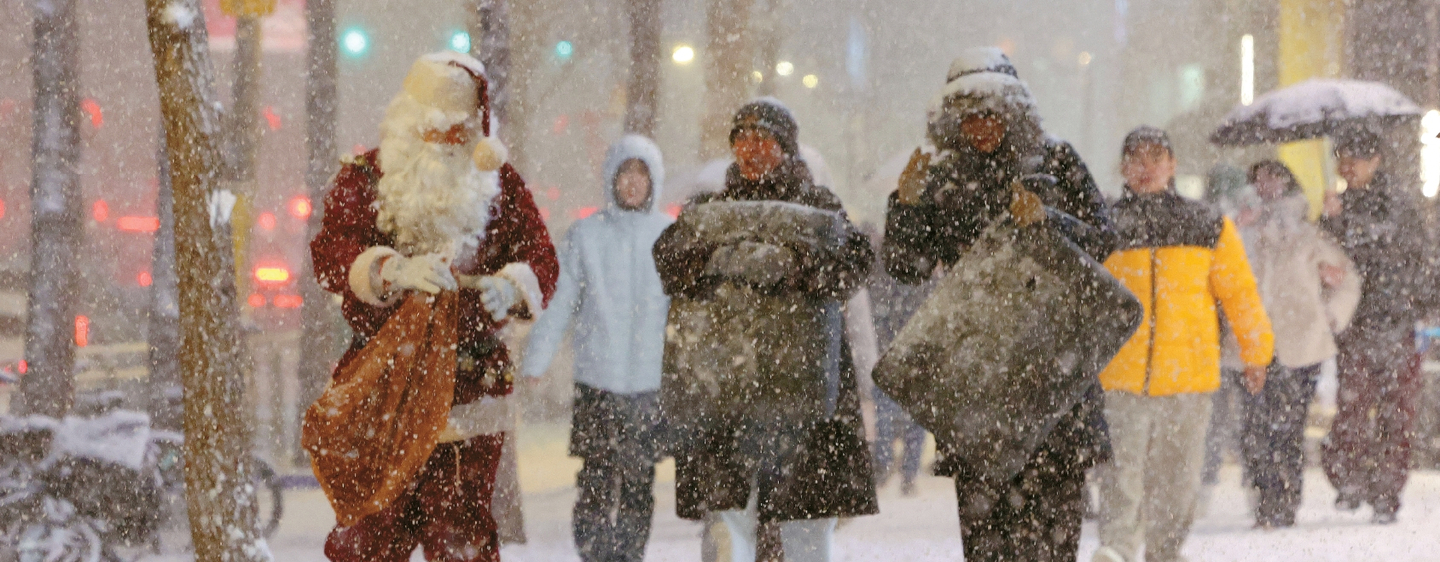한국시간으로 지난 4일, 서울에 올 겨울 첫눈이 내렸다. 서울·인천·경기·강원 등 수도권과 중부 전역에 대설특보가 발효된 가운데, 서울 마포구 홍대 인근 거리에는 굵은 눈발이 밤하늘을 가득 메우며 도심을 순식간에 설경으로 바꿔놓았다. 두툼한 패딩과 모자를 쓴 시민들이 눈을 맞으며 발걸음을 재촉하는 사이, 산타클로스 복장을 한 외국인 관광객이 눈 덮인 인도를 걸으며 첫눈의 정취를 만끽하고 있다. 소담스럽게 내리는 눈 속에서 연말 분위기와 여행자의 설렘, 그리고 도심의 분주한 일상이 한 프레임에 겹쳐졌다.
