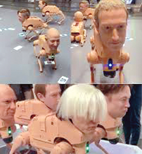 아티스트 비플(Beeple·본명 마이크 윙켈만)이 아트 바젤 마이애미비치 ‘Zero 10’ 섹션에 출품한 설치작품 ‘Regular Animals(2025)’ 속 로봇 개들이 화제를 모으고 있다. 주요 기술 기업 수장을 연상시키는 하이퍼 리얼리즘 마스크를 장착한 로봇들은 이동하며 인증서 형태의 출력물을 배출하고, 관람객은 QR 코드를 통해 관련 NFT를 구매할 수 있다. 아트 바젤 마이애미비치는 오는 17일까지 열린다. [아트 바젤 페이스북 캡처]