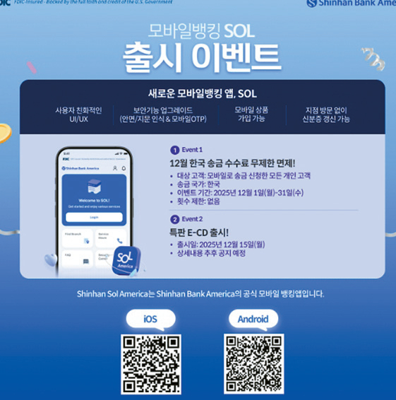 신한아메리카 측은 “SOL 앱 출시는 국내 한인 금융고객의 디지털 금융 경험 확대에 기여할 것으로 기대된다”며 “고객 관점에서 디지털 뱅킹 서비스를 지속적으로 업그레이드해 나갈 계획”이라고 밝혔다.