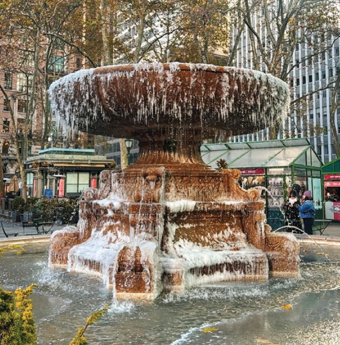 이번 달 들어 센트럴파크 인근 기온이 평년보다 화씨 7도 낮아지는 등 뉴욕일원에 한파가 지속되는 가운데, 이같은 날씨가 크리스마스까지 이어질 것으로 전망된다. 기상 당국은 향후 10일 안팎으로 계속 찬 공기 흐름이 뉴욕일원에 머물 전망이라고 예측했다. 9일 한파로 인해 맨해튼 브라이언트파크 분수가 언 모습.