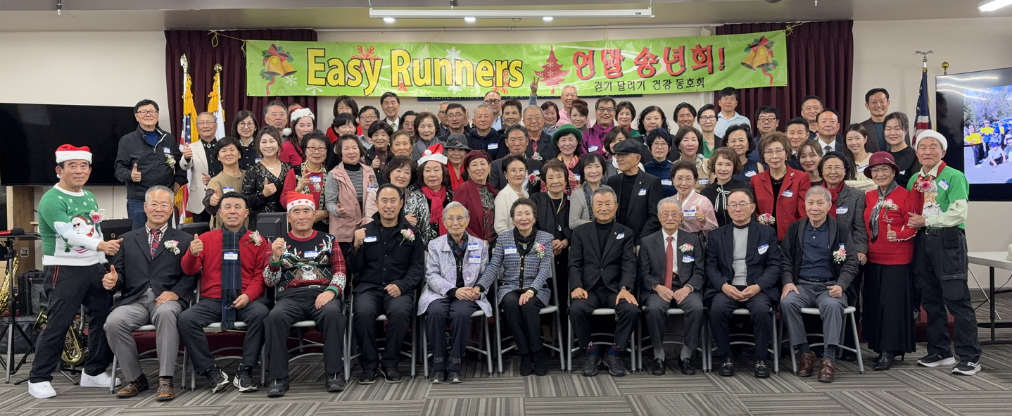마라톤 동호회 ‘이지러너스(공동 회장 저스틴 이·이강열)’는 지난 7일 가든그로브의 OC한인회관에서 송년회를 가졌다. 이날 송년회에선 91세 김재석씨, 87세 동갑인 김명환 초대 회장과 그의 부인 케티 김씨도 참석, 젊은 회원들과 어울려 즐거운 시간을 가졌다. 문의는 채영자 팀장(562-841-1530)에게 하면 된다. 참석자들이 함께 자리했다.