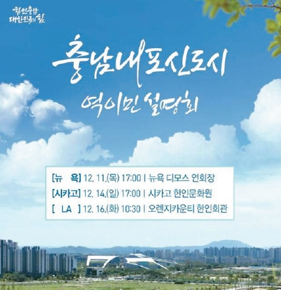 충청남도가 내포신도시 재외동포 역이민 유치 설명회를 오는 16일 오전 10시 30분, 오렌지카운티 한인회관에서 개최한다.