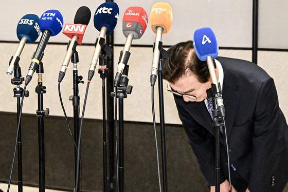 전재수 해양수산부 장관이 11일 오전 인천공항에서 통일교 금품 수수 의혹에 대한 입장을 밝힌 뒤 인사하고 있다. ‘유엔 해양총회’ 유치 활동차 미국을 방문했던 전 장관은 이날 “불법적인 금품 수수는 없었다”며 사의를 표명했다.