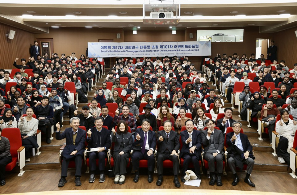서울시립대학교(총장 원용걸)는 2025년 12월 10일(수) 자연과학관 대회의실에서 이명박 제17대 대통령을 초청해 ‘서울시 버스개혁과 청계천 복원: 성과와 교훈(Seoul’s Bus Reform & Cheonggyecheon Restoration: Achievements & Lessons Learned)’을 주제로 제101차 어번인프라포럼을 개최했다고 밝혔다. 이날 포럼에는 개발도상국 공무원 연수생과 대학(원)생 등 약 200여 명이 온·오프라인으로 참석했다.