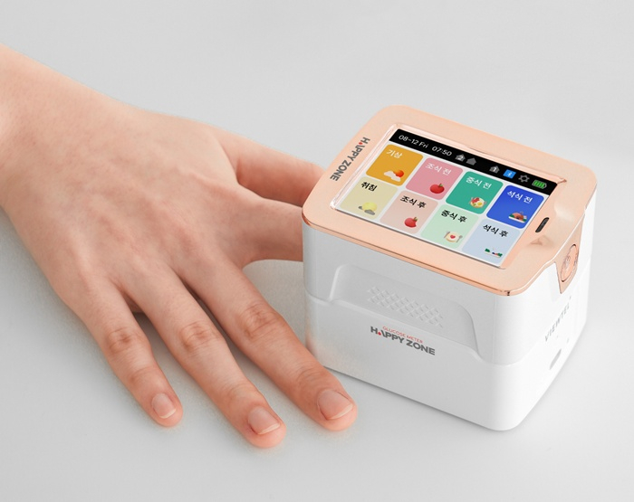 기존 침습 혈당측정기는 번거롭고 고통스러우며, 외부 활동 시 사용이 불편했다. 반면, ‘해피존’은 피를 뽑지 않고 혈당을 측정하는 세계 최초 광투과 기술을 적용한 기기로, 한 대를 두 명이 사용할 수 있다.