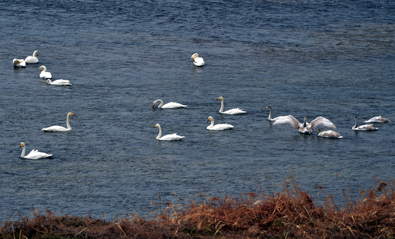 천연기념물 제201-2호 큰고니(백조)들이 15일 오후 충북 영동군 금강을 찾아 먹이 활동을 하고 있다. 고니는 시베리아 등지에서 한반도로 날아와 월동한다. 호수나 저수지·하천·해안 등에 무리지어 서식한다.