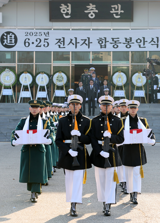 15일 국립서울현충원에서 열린 6·25 전사자 발굴 유해 합동 봉안식에서 국군의장대가 영현을 봉송하고 있다. 이날 정부는 지난 3월부터 11월까지 강원도 철원 등 6·25 전쟁 격전지 34개 지역에서 발굴한 유해 141위를 봉안했다.