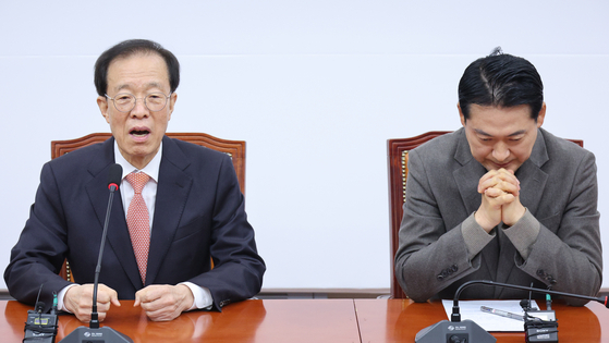 이석연 국민통합위원장(왼쪽)이 16일 국회에서 장동혁 국민의힘 대표를 만나 발언하고 있다. 이날 이 위원장은 장 대표에게 “다수 국민의 뜻을 좇아 정도(正道)를 가야 한다. 헌법 파괴 세력과 단절해야 한다”고 당부했다. [뉴스1]