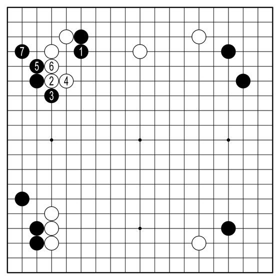 ◆실전 진행=실전을 먼저 본다. 흑1은 절대의 한 수고 백2의 붙임도 예상되는 공격 방향. 흑3, 5는 선수다. 문제는 그다음인데 신진서는 흑7에 두었다. 처음 보는 수다. 보통은 밀거나 날일자로 두는데 왜 이렇게 두었을까. 혹시나 해서 AI를 보니 놀랍게도 이 수가 블루 스폿이다.