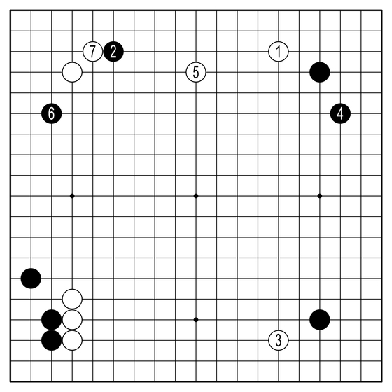 신진서가 흑이다. 4개의 화점에 이어 흑이 좌하 삼삼에 들어갔고 연속 날일자 퍼레이드가 펼쳐졌다. 백7은 강렬한 수. AI도 긍정적이다.