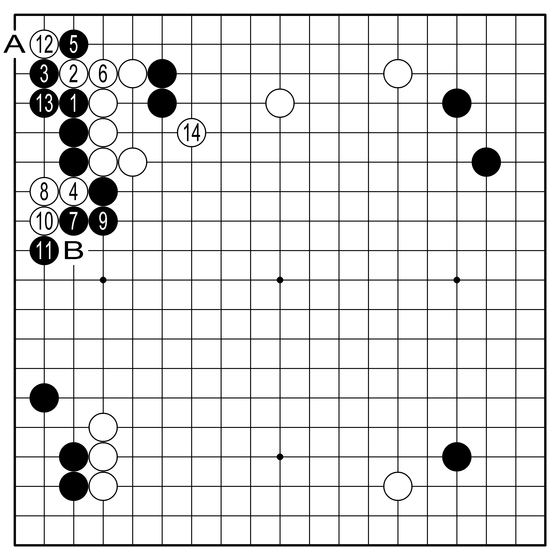 ◆AI의 변화=흑1로 밀면 백2로 막은 뒤 4로 끊는다. 백이 좌변을 내주고 상변을 취하는 건 실전과 같다. 하나 이 그림은 실전보다 백이 좋다. 백은 A가 선수다. B의 맛을 노리기 위해 아껴두고 있는 것.
