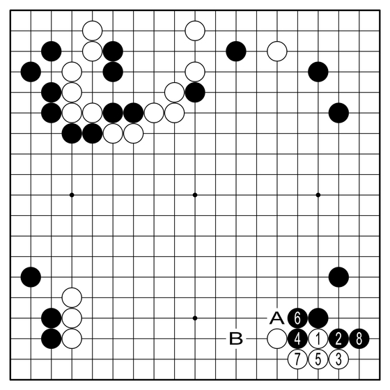 ◆실전 진행=백1로 붙이고 3으로 젖힌다. AI 등장 이후 가장 많이 두어진 정석이다. 변화는 꽤 있다. 우선 흑8은 A에 미는 수도 많이 두어진다. 그냥 8에 둔 것은 하변이 백집이 되는 게 싫다는 의사 표시다. 여기서 백도 두 갈래 길이다. A로 강하게 밀어 올릴 것인가, B로 중간의 길을 걸을 것인가.