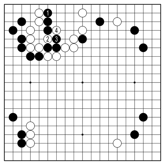 ◆흑 한 수 부족=당장 흑1로 막는 것은 안 된다. 백2, 4로 회돌이 친 뒤 밖을 꾹꾹 막으면 흑이 한 수 부족하다. 그러나 맛이 나빠 조심해야 한다. 이곳은 패감 공장이니까 패도 안 된다.