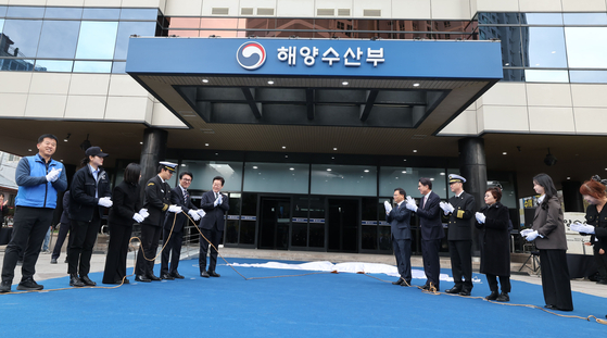 이재명 대통령(왼쪽 여섯째)이 23일 부산 해양수산부 임시 청사 현판 제막식에서 박수를 치고 있다. 이 대통령은 이날 해수부 임시 청사에서 국무회의를 주재하며 “해양수산부 이전은 국토 균형 발전의 중대한 계기가 될 것”이라고 말했다.