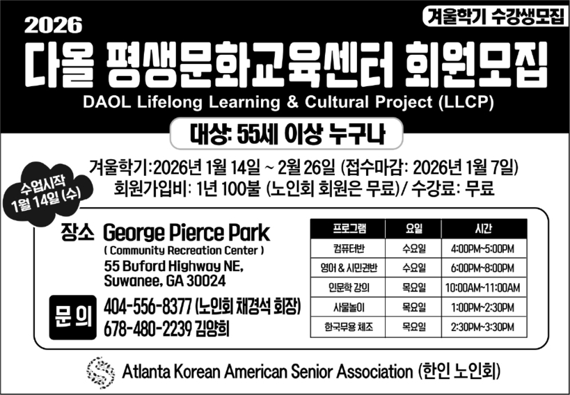 애틀랜타 한인 노인회(회장 채경석)는 내달 14일부터 영어 교육 및 시민권 취득을 위한 평생교육센터 겨울학기를 시작한다. 조지 피어스 공원에서 매주 수요일 오후 6시부터 2시간동안 진행된다. 이외 컴퓨터반, 인문학, 사물놀이, 한국무용 등도 들을 수 있다. 문의=404-556-8377, 678-480-2239