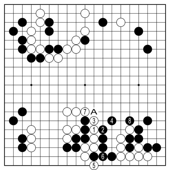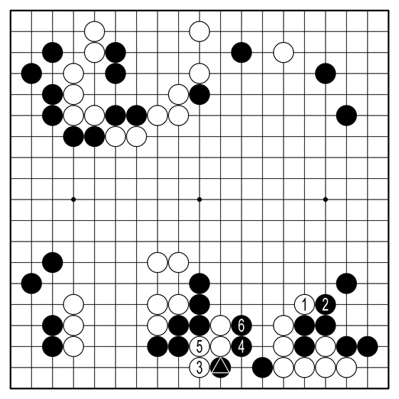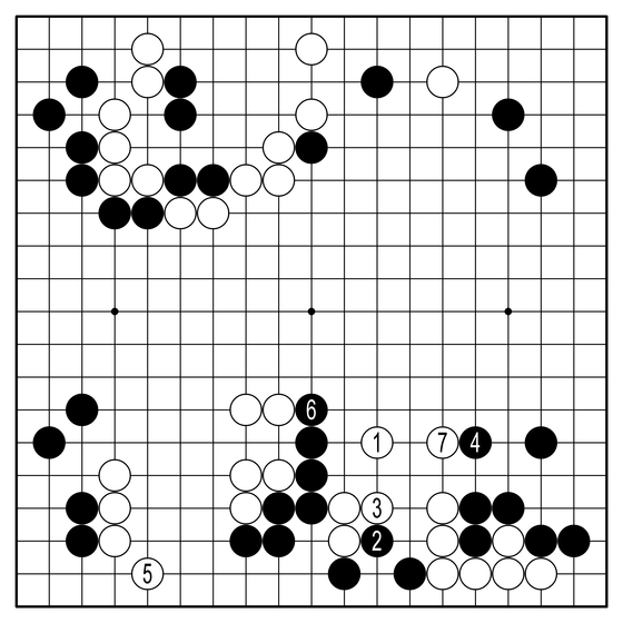 ◆AI의 수습책=AI의 사전에는 굴욕이나 기세 같은 단어는 없다. AI는 백1에 두어 넘겨주는 게 최선이라고 한다. 인간의 눈엔 너무 억울하지만 백7까지 냉정하게 수습하면 승률 10%, 7집반 불리라고 한다.