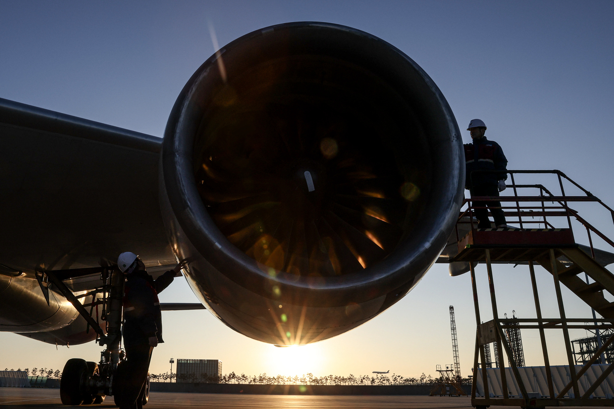 해 질 무렵 인천국제공항 아시아나항공 제2격납고에서 이준희(왼쪽)·김영균 정비사가 항공기 엔진을 살펴보고 있습니다. 말로 다 하지 못한 수고는 저무는 노을에 잠시 내려두고 손은 다시 내일을 향해 움직입니다.