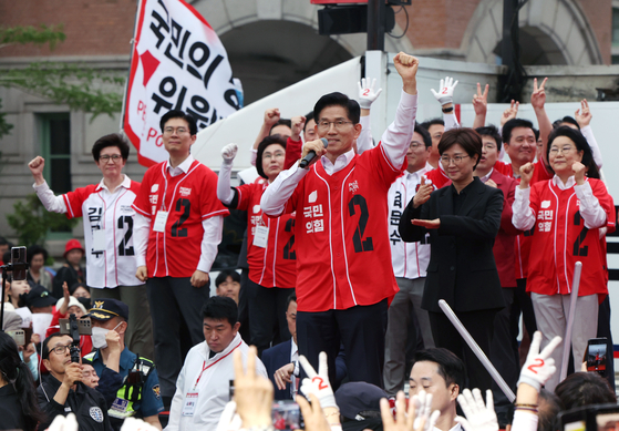 28일 기획예산처 장관 후보자로 지명된 이혜훈 전 의원(오른쪽)이 지난 5월 당시 김문수 대통령 후보 유세에서 지지를 호소하고 있다.