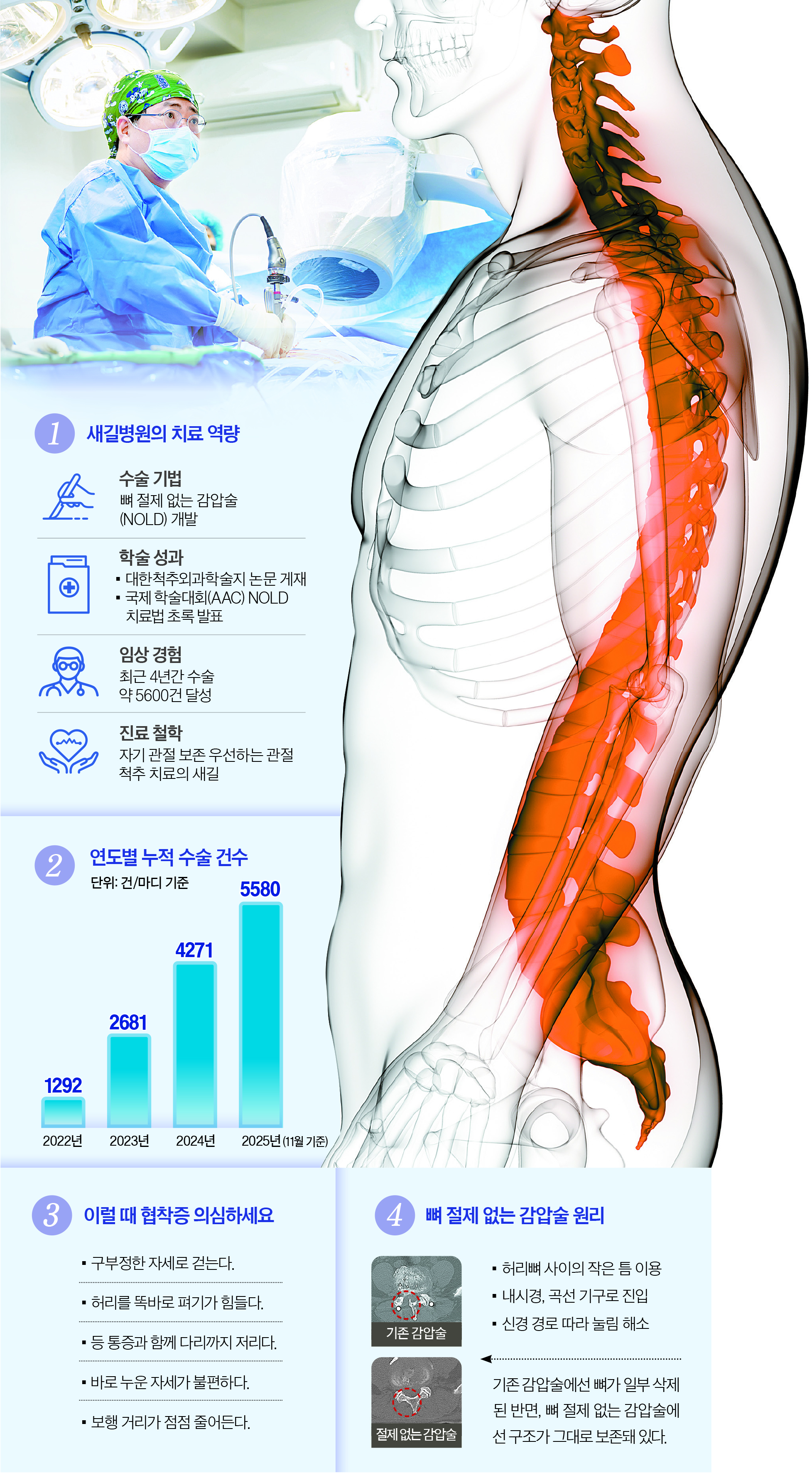 척추 수술이라고 하면 아직도 많은 이들이 ‘뼈를 깎는 치료’를 떠올린다. 이런 뿌리 깊은 인식 탓에 척추 질환이 있어도 병원 문턱을 넘지 못하는 환자가 적지 않다. 그런데 최근 이 고정관념을 흔드는 변화가 나타났다. 뼈는 그대로 두고 압박된 신경만 정교하게 넓혀주는 척추 감압(신경 눌림 감소) 수술이 확산하고 있는 것. 변화의 중심에는 서울 영등포의 새길병원이 있다. 이대영 새길병원장은 지난 4년간 5600여 건의 ‘뼈 절제 없는 척추 감압 수술(NOLD)’을 시행해 왔다. 덕분에 오랫동안 굳어졌던 ‘척추 수술=뼈 절제’ 공식을 뒤집고, 뼈를 보존하는 새로운 치료 기준을 제시한 것으로 평가받는다. 이 병원장은 “고령화가 빨라지면서 척추 질환의 의미도 달라지고 있다”며 “이제는 통증을 줄이는 문제를 넘어 얼마나 오래 걷고 생활할 수 있는지가 노년의 삶을 결정한다”고 강조했다.