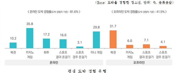 평생 경험한 도박 유형은 온라인 카지노 게임(35.8%), 오프라인 복권(31.7%), 온라인 미니게임(29.8%), 온라인 화투게임(17.2%), 온라인 스포츠 결과 돈걸기(16.0%), 온라인 복권(10.2%) 등의 순으로 나타났다. 특히 상위 6개 유형 중 오프라인 복권을 제외한 5개 항목이 모두 스마트폰이나 PC를 통한 온라인에 기반한 도박인 것으로 확인되었다.