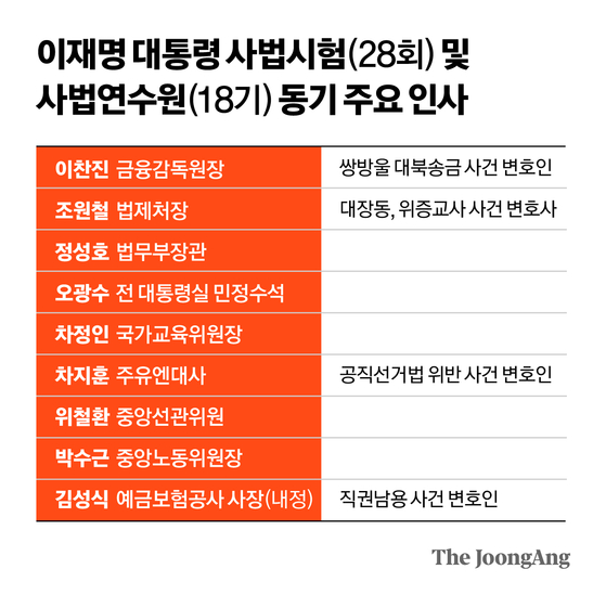 이 대통령 취임 이후 사법연수원 18기 동기들도 정부 요직을 줄줄이 꿰차고 있다. 정성호 법무부 장관, 조원철 법제처장, 이찬진 금융감독원장, 차정인 국가교육위원장, 위철환 중앙선관위원, 차지훈 주유엔대사, 오광수 전 대통령실 민정수석 등이다. 이 대통령은 지난달 14일엔 장관급인 중앙노동위원장에 박수근 한양대 명예교수(사법연수원 18기)를 임명했다.
