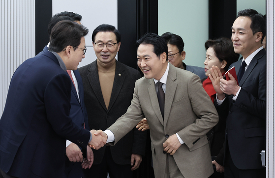 정청래 더불어민주당 대표가 31일 전주 시장에서 떡을 사고 있다(위쪽 사진). 같은 날 장동혁 국민의힘 대표가 종무식에서 의원들과 인사하고 있다. [연합뉴스]