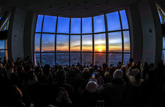 2026년 새해가 밝았다. 1일 첫 일출을 맞으려는 시민들은 최북단 강원도 고성부터 최남단 제주까지 전국 해돋이 명소를 가득 메웠다. 매서운 한파도 첫해를 직접 눈에 담으려는 사람들의 마음마저 꺾지는 못했다. 서울 송파구 서울스카이 전망대를 찾은 시민들이 이날 오전 7시48분쯤 옅은 구름을 뚫고 떠오르는 붉은 해를 휴대전화에 담고 있다.