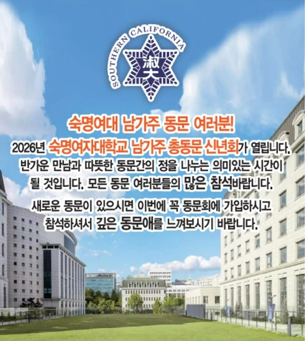 '숙명여자대학교 남가주 동문회'가 오는 17일(토) 오후 5시, 세리토스 퍼포밍 아트 센터 시에라룸에서 신년회를 개최한다. 이번 행사는 남가주 지역 동문들이 한자리에 모여 새해 인사를 나누고 동문 간 우정을 다지는 뜻깊은 자리로 마련됐다. 참가비는 1인 100달러, 부부 동반 시 150달러로 책정됐다. 드레스코드는 파티 드레스 또는 이브닝 드레스, 남성은 정장을 권장한다. 동문회 측은 "새해를 여는 의미 있는 만남에 많은 동문들의 적극적인 참여를 바라며, 이 자리를 통해 깊은 동문애를 느껴보시길 바란다"고 전했다.