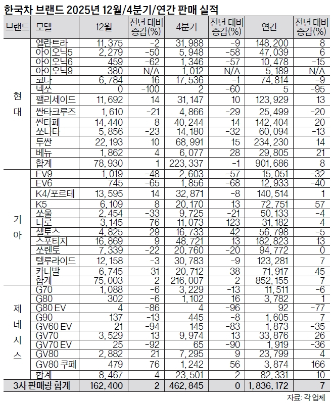 현대차·기아·제네시스 등 한국차 브랜드가 발표한 연간 판매 실적 보고서에 따르면, 3사는 2025년 한 해 동안 총 183만6172대를 판매해 전년 대비 7% 늘었다. 한국차의 국내 판매량이 180만 대를 넘어선 것은 이번이 처음이다. 〈표 참조〉