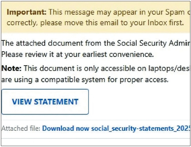 사회보장국(SSA)을 사칭해 사회보장 명세서를 다운로드하라고 유도하는 이메일 사기가 전국적으로 확산하고 있어 각별한 주의가 요구된다.