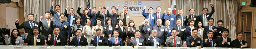 2026년 새해를 맞아 LA한인상공회의소(회장 정상봉) 주최로 한인 기업들의 도전과 도약을 다짐하는 신년하례식이 지난 5일 옥스포드 팔레스 호텔에서 열렸다. 이날 행사에는 한인상의 회장단과 하기환 한남체인 회장, 로버트 안 LA한인회장, 장병우 민주평통 LA협의회 회장, 오상교 오픈뱅크 행장 등 한인사회 주요 인사들이 참석해 신년 주요 사업과 계획을 나눴다. 하례식 후 참석자들이 모여 파이팅을 외치고 있다. [LA한인상의 제공]