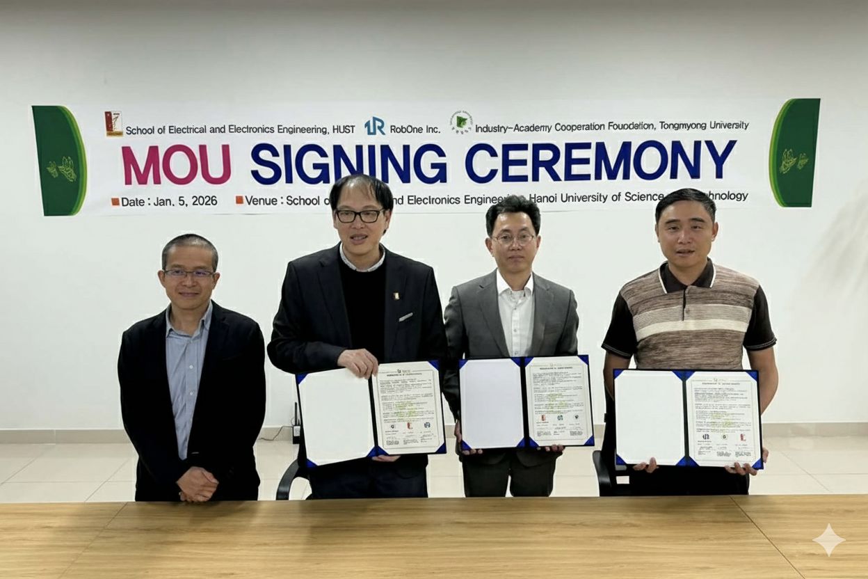 동명대학교 산학협력단(단장 조현태, 컴퓨터공학과 교수)은 지난 5일 베트남 하노이에 위치한 하노이과학기술대학교(HUST)에서 하노이과학기술대 전기전자공학부 및 (주)로보원과 함께 차세대 로봇 시스템과 인공지능 기술 개발 및 활성화를 위한 업무협약(MOU)을 체결했다.