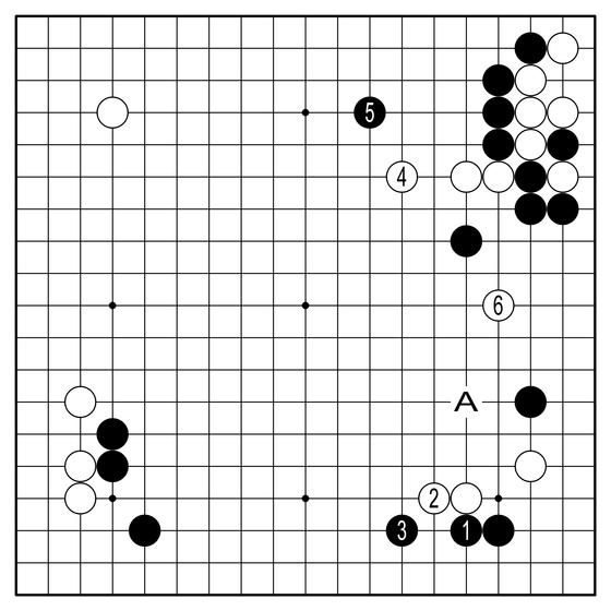 ◆난전=끊는 대신 흑1, 3으로 곱게 받아주는 수(실리를 챙기는 수)는 어떨까. 이 경우 AI가 제시하는 백4, 6이 놀랍다. 백A가 아니고 6까지 들어가는 수는 일대 난전을 예고하는 굉장한 강수다.
