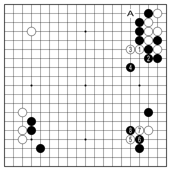 ◆실전 진행=먼저 실전을 본다. 박정환은 백1, 3으로 전투를 선택했다. 꼭 그럴까. 아니다. 아직은 동태를 보고 있다. 백 두 점은 아직 살릴 수도 있고 죽일 수도 있다. 흑4는 올바른 방향. 위쪽 흑은 A가 선수여서 생각보다 강하다. 여기서 백은 예정대로 5로 씌웠고 흑도 망설임 없이 6, 8로 절단했다. 바둑이 초장부터 포연이 자욱하다.
