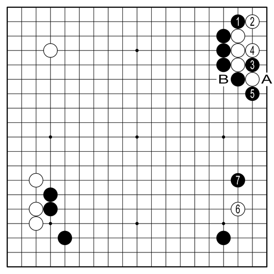 장면②=정석이란 미묘한 존재다. 같은 정석이라도 누가 쓰느냐에 따라 천차만별의 차이가 난다. 그래서 수순을 암기하는 데서 나아가 수순을 이해하는 게 중요하다. 흑1로 젖히고 3으로 끊어 본격적인 AI 정석에 진입한다. 백이 4를 선택하면 흑은 5로 단수한다. 박정환 9단은 여기서 백6으로 달려갔는데 추이를 봐가며 A로 따낼지 B로 끊을지를 결정하려고 한다. 정석은 정석으로 끝나는 게 아니고 중반 전투와 깊이 연결되어 있다. 스웨 9단도 7로 협공했다.