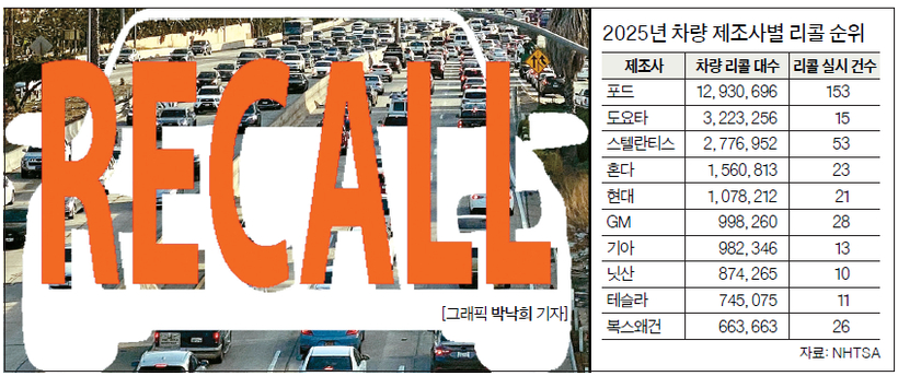 도로교통안전국(NHTSA) 2025년 리콜 통계 현대차 21건 5위·기아 13건 7위로 전년비 개선 포드 1290만대 압도적 1위…도요타·혼다 2·4위 전문가 "리콜 수치만으로 신뢰도 판단은 무리"
