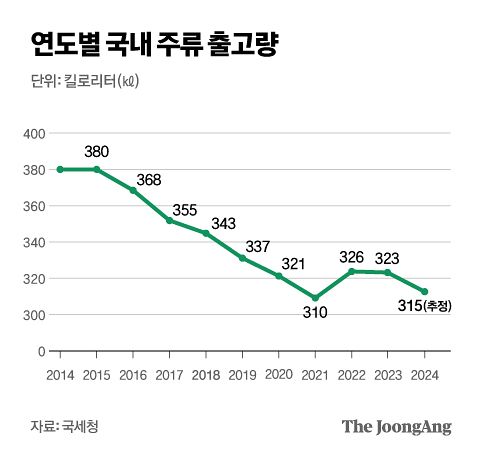 원인은 복합적이다. 경기 침체와 물가 상승에 따른 소비 감소가 직접적인 영향이다. 1인 가구 증가에 따른 주류 소비문화 변화도 더해졌다. 건강을 중시하는 소비 패턴도 술 소비가 줄어든 원인으로 꼽힌다. 주류 소비 감소는 통계로 확인할 수 있다. 국세통계포털에 따르면 2024년 국내 희석식 소주 출고량은 전년 대비 3.4% 감소한 81만 5712㎘(킬로리터)를 기록했다. 같은 기간 맥주 출하량은 163만 7210㎘ 로 전년 대비 3% 줄었다.