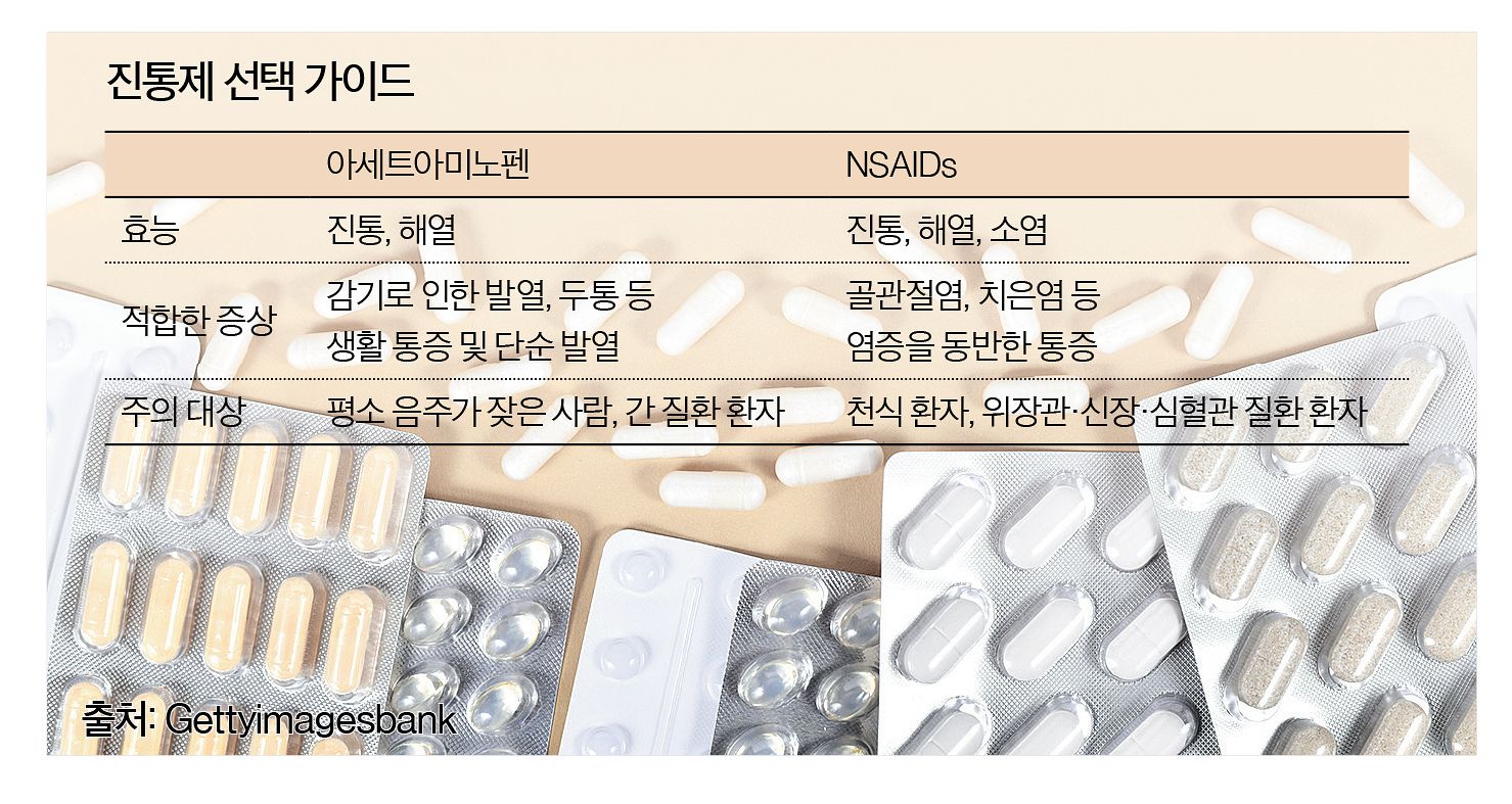 진통이 목적일 땐 일반적으로 NSAIDs가 우선 고려된다. 다만 위궤양이나 신장 질환 환자는 부작용 예방을 위해 아세트아미노펜이 더 적합할 수 있다. 가톨릭대 약학대학 임성실 교수는 “PGE2는 혈관을 확장해 위 점막 혈류를 늘리고, 위산을 희석해 점막을 보호하는 역할을 한다”며 “NSAIDs는 이 물질의 생성을 억제해 장기 복용 시 궤양이 생긴다”고 설명했다. PGE2 생성이 억제되면 신장 혈류도 감소해 신장 기능장애가 발생할 수 있다. 또 소아·청소년이 독감이나 수두에 걸린 상태에서 NSAIDs를 복용하면 뇌·간 손상, 혼수 등을 동반하는 라이증후군이 발생할 수 있어 아세트아미노펜을 우선 사용하는 것이 권장된다.