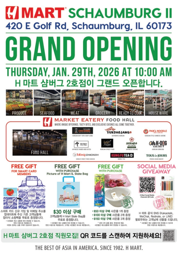 H마트 브라이언 권 사장은 “샴버그 지역에 아시아의 정통 식문화를 소개하게 돼 기쁘다. H마트는 아시아 요리의 깊이와 다양성을 널리 알리고, 고객들이 사랑하는 그 맛을 가까운 곳에서 가장 편리하게 접할 수 있도록 최선을 다하고 있다”고 밝혔다.