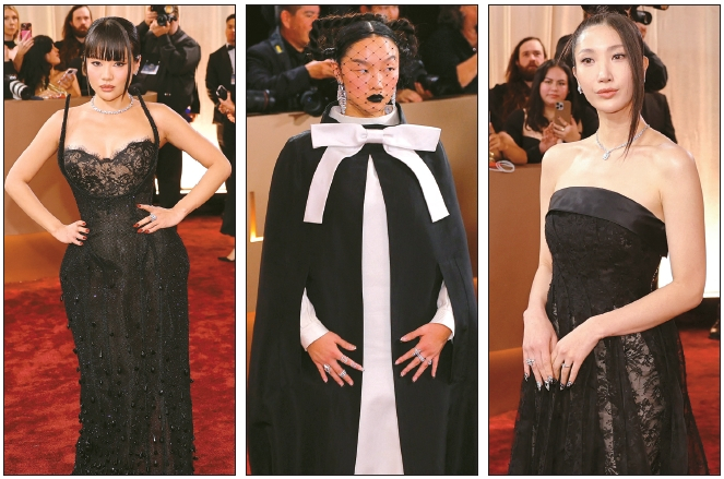 제83회 골든글로브 시상식이 11일 베벌리 힐튼 호텔에서 열렸다. 이날 시상식에서는 K팝을 소재로 한 애니메이션으로 화제를 모은 ‘K팝 데몬 헌터스(케데헌)'의 주인공들도 레드카펫을 밟았다. 사진 왼쪽부터 레이 아미(조이 역), 오드리 누나(미라 역), 이재(루미 역). 상보는 Koreadaily.com