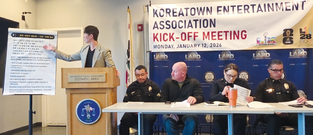 LA한인타운 노래방 업주들이 만든 ‘K타운 엔터테인먼트 협회(Ktown Entertainment Association·KEA)’ 발족식이 12일 올림픽경찰서 커뮤니티룸에서 열렸다. 이 단체는 한인타운 야간 환경 안정화와 불법 행위 근절, 업계 신뢰 회복 등을 위해 업주들이 자발적으로 결성했다. 리사이틀 노래방 라이언 강(맨 왼쪽) 부사장이 LAPD 경관들을 비롯한 참석자들에게 단체 발족 취지를 설명하고 있다.