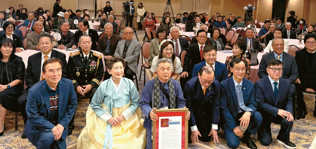 미주 한인의 날 기념행사 한인 이민 123주년을 기념하는 미주 한인의 날 행사가 12일 LA 한인타운 옥스퍼드 팔레스 호텔에서 열렸다. 이병만 미주한인재단 LA 회장이 최석호 가주 상원 의원이 보낸 기념 결의문을 들고, 참석자들과 함께 미주 한인의 날을 축하하고 있다. 〈관계기사 4면〉