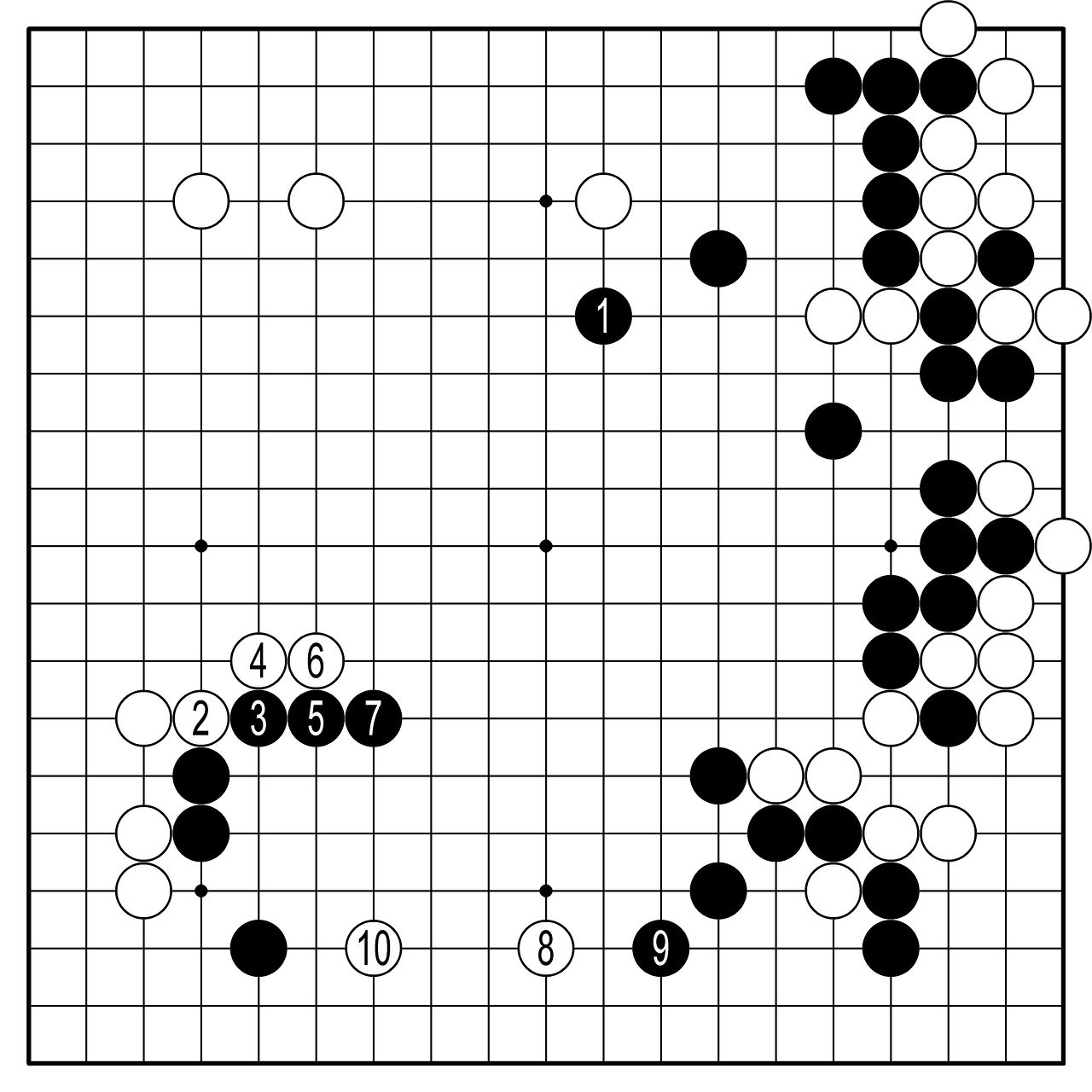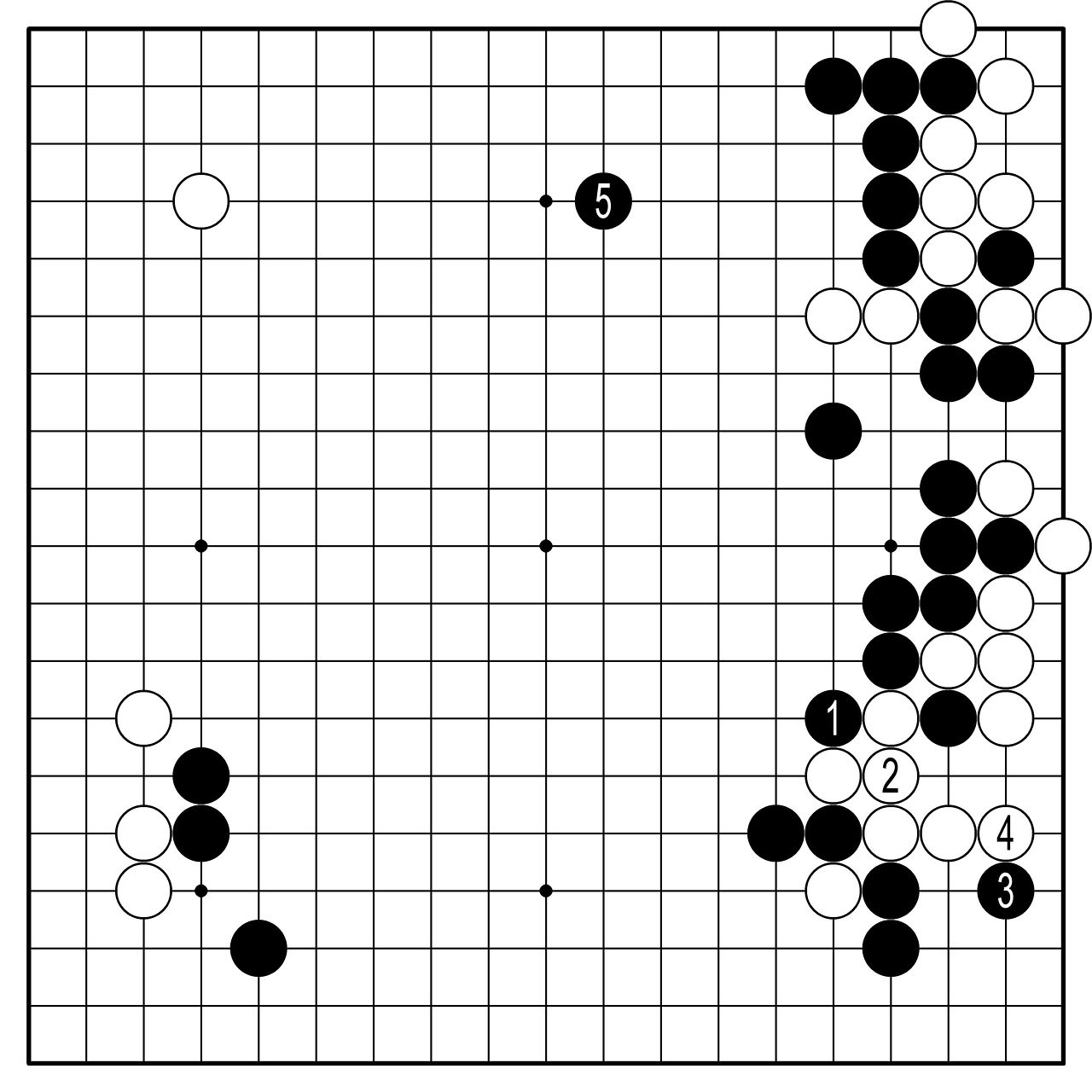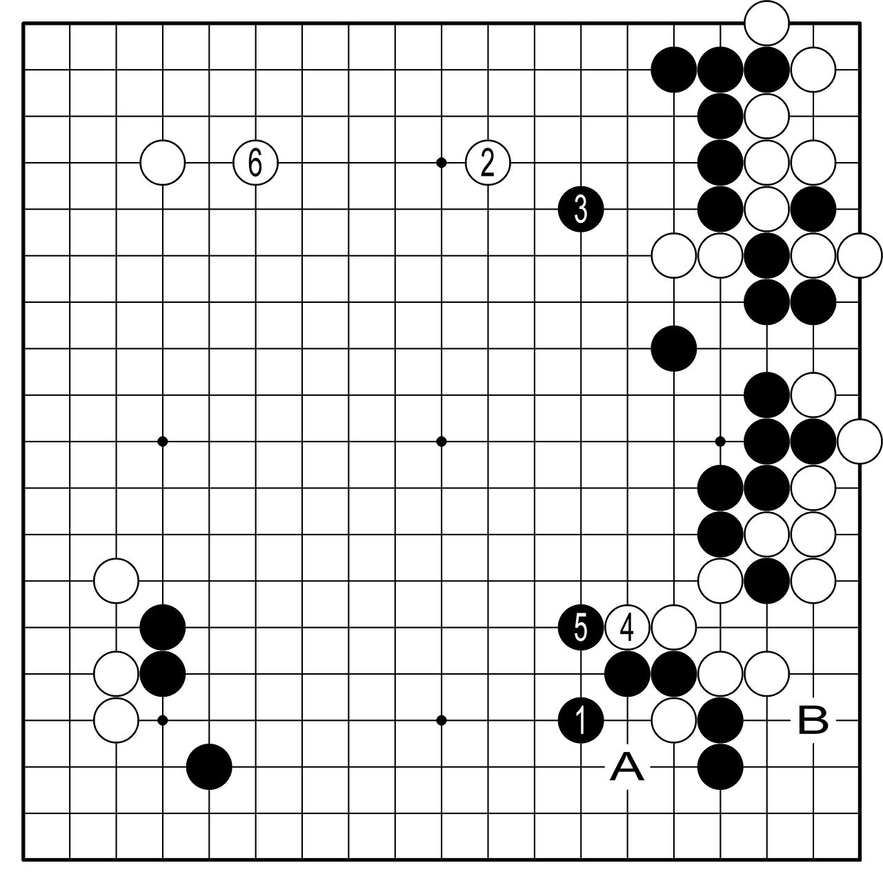 ◆AI의 선택=흑1은 선수다. 흑3도 선수다(백이 손 빼면 4의 곳을 밀고 들어간다. 그것으로 백 대마가 미생이 된다). 그다음 5의 곳을 둔다. 기존에 투자된 흑의 숱한 돌들이 이 수로 인해 비로소 빛을 얻는다. 하나 실전은 이 언저리를 백에게 선수당해 장대한 흑 세력이 빛을 잃었다.
