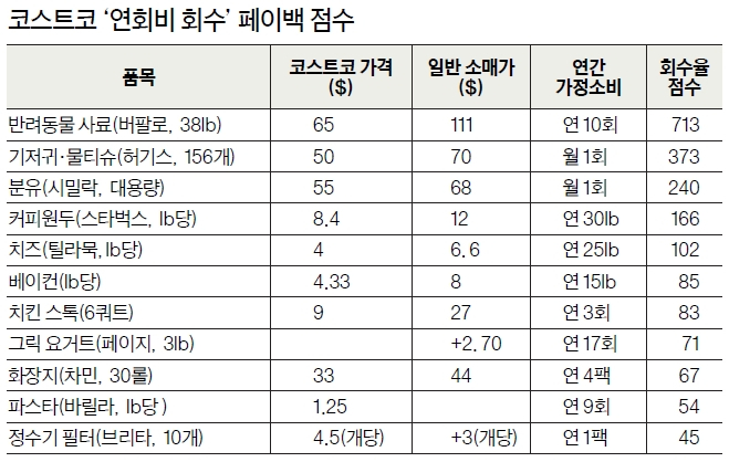 일반 소매점 가격 111달러 수준인 블루버팔로 반려견 사료(38파운드)는 코스트코에서 65달러로 한 번 살 때마다 약 46달러가 절약된다. 연간 10회 구매를 가정하면 회수율 점수는 713에 달한다.