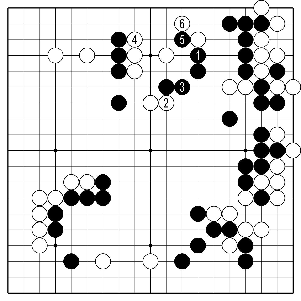 ◆실전 진행=실전에서 스웨는 흑1을 선택했다. 수비에 치우친 수. 절호의 공격 기회를 스스로 버렸다. 백4가 타개의 요소. 흑5엔 6이 맥점. 백 대마가 순식간에 안전권에 들어섰고 형세는 팽팽해졌다.