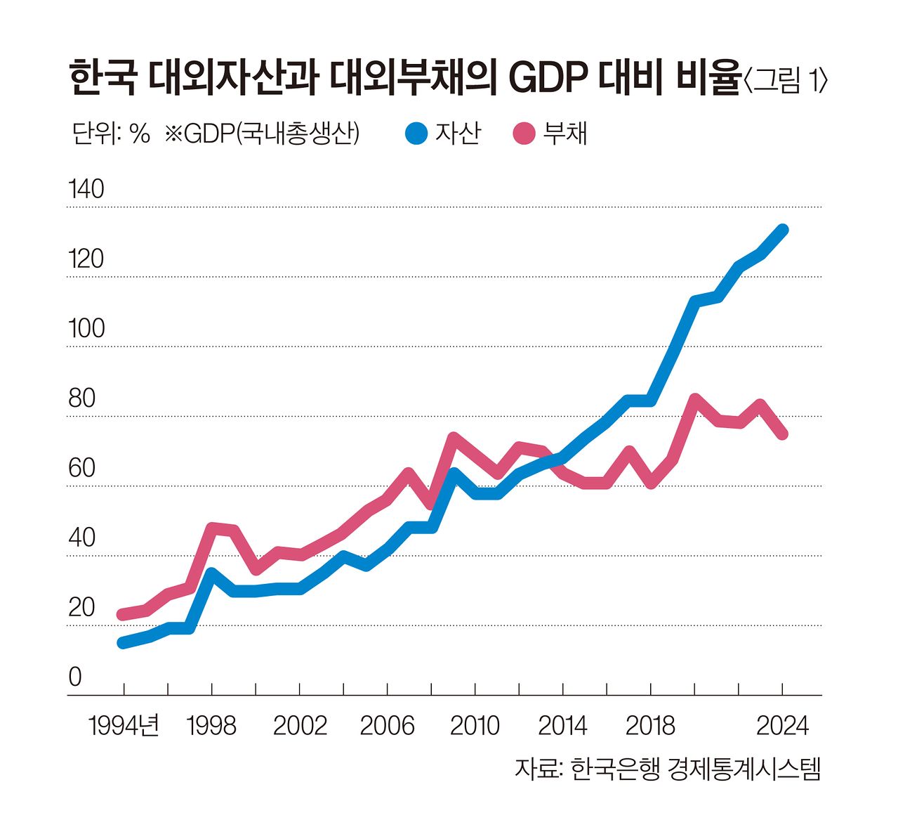 대외 자산과 부채의 비대칭적 구조 최근 한국의 금융 글로벌화 과정의 또 다른 특징은 대외 금융자산과 부채의 증가 속도가 비대칭적이라는 것이다. 글로벌 금융위기 이후 대외 금융부채의 축적은 완만하지만, 대외 금융자산의 축적은 급격히 증가했다. 특히 주식 거래의 차이가 상당 부분을 설명한다. 2024년 말까지 지난 10년간 한국은 2873억 달러의 해외 주식을 순매수한 반면, 외국은 70억 달러의 한국 주식을 순매도하였다. 한국은 더 많은 해외 금융자산을 매입하고 있고 구입한 미국 주식 등의 가격도 급격히 상승한 반면, 외국은 한국 주식을 순매도했을 뿐 아니라 기존 자산의 가치도 더 천천히 올라간 점이 반영돼 있다. 지속적인 경상수지 흑자를 통해 벌어들인 달러로 대외 금융자산을 추가로 구입할 수 있었던 측면도 있다.