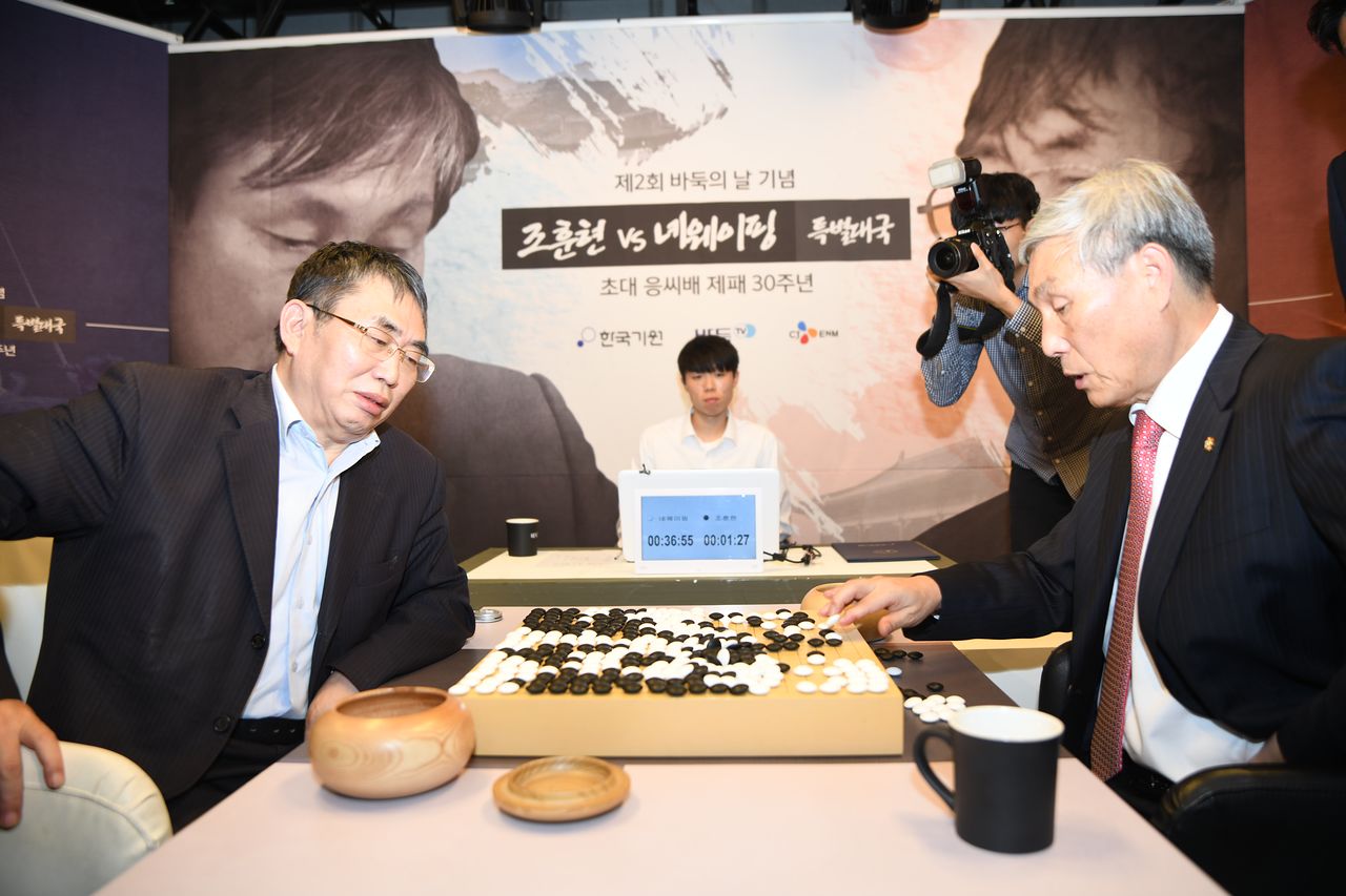 녜웨이핑 9단(왼쪽)이 2019년 서울 한국기원 바둑TV스튜디오에서 열린 ‘초대 응씨배 제패 30주년 특별대국’에서 조훈현 9단과 대국하고 있다. [사진 한국기원]